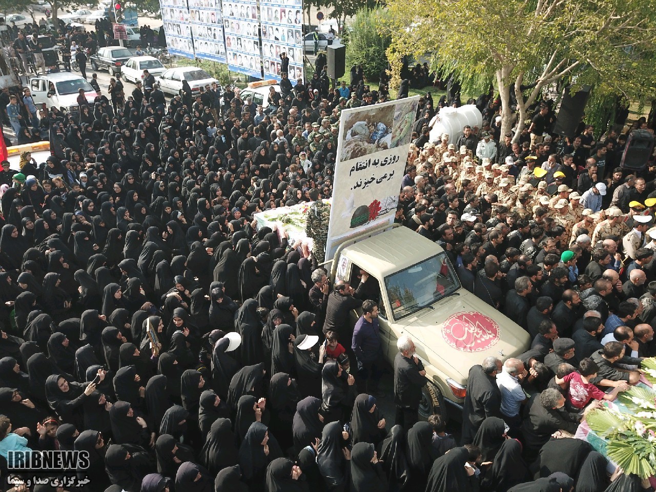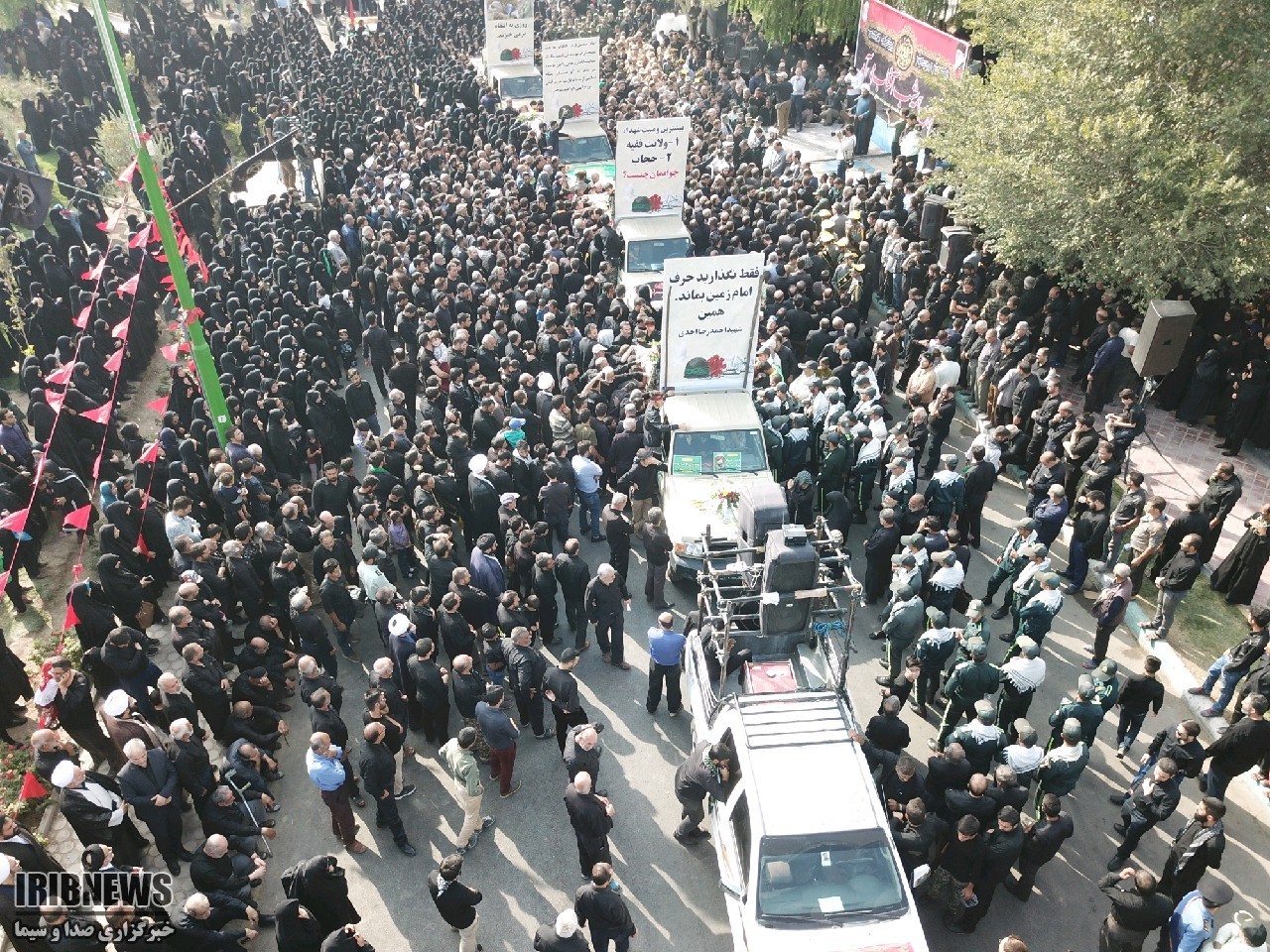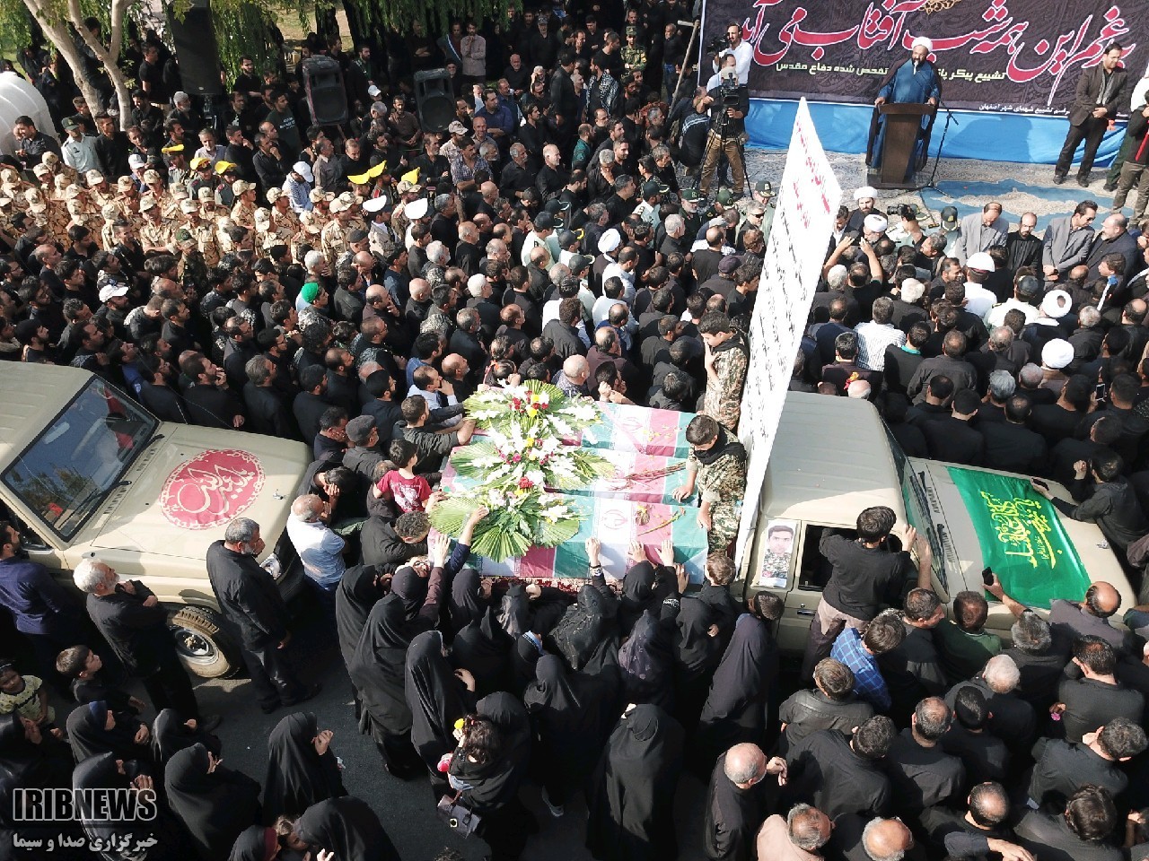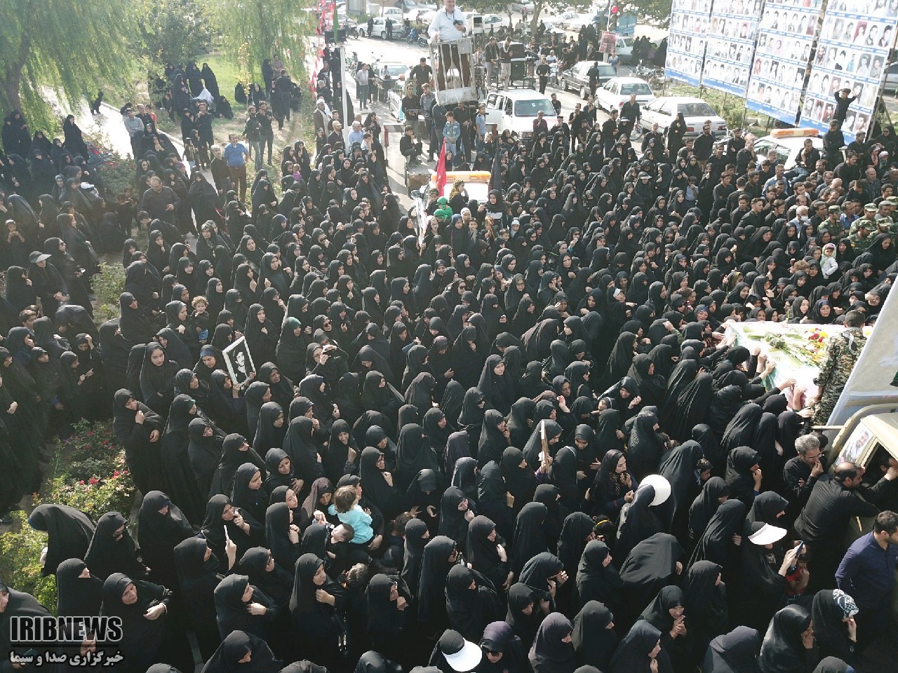 دست بر سینه و دیده پر اشک به یاد ِ دورانِ پر خاطره جنگ زیر تابوت‌ها را گرفته اند و تابوت ها را بوسه می زنند و نوای یا حسین سر می دهند.