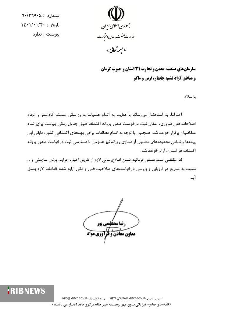در این نامه آمده است: با عنایت به اتمام عملیات به روز رسانی سامانه کاداستر (حدنگار) و انجام اصلاحات فنی ضروری، امکان ثبت درخواست صدور پروانه اکتشاف طبق جدول زمانی پیوست برای تمام متقاضیان برقرار خواهد شد.
