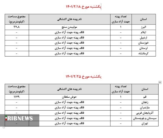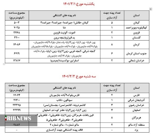 همچنین با توجه به اتمام مطالعات برخی پهنههای اکتشافی کشور، مابقی پهنهها و تمامی محدودههای مشمول آزادسازی روزانه نیز همزمان با دسترسی ثبت درخواست صدور پروانه اکتشاف هر استان، آزاد خواهد شد.