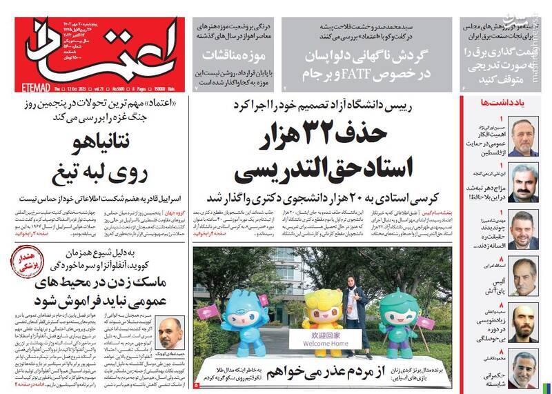 صفحه نخست روزنامه‌های پنجشنبه ۲۰ مهر
