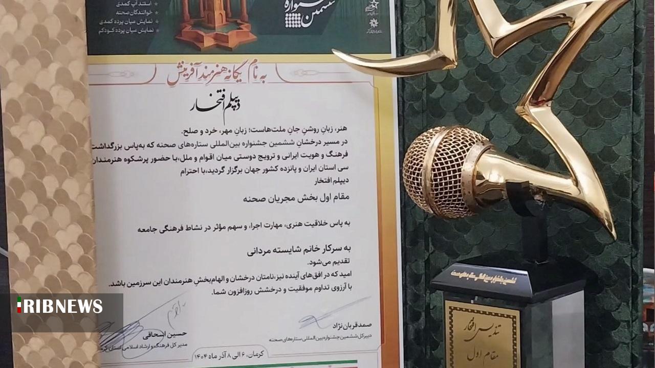 شایسته مردانی مجری صدا و سیمای مرکز کردستان مقام نخست بخش مجریگری جشنواره بینالمللی ستارگان صحنه را به عنوان تنها نماینده استان به خود اختصاص داد.